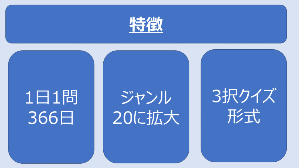 • 特徴1:1日1問・366問で、1年中クイズ習慣が続く!